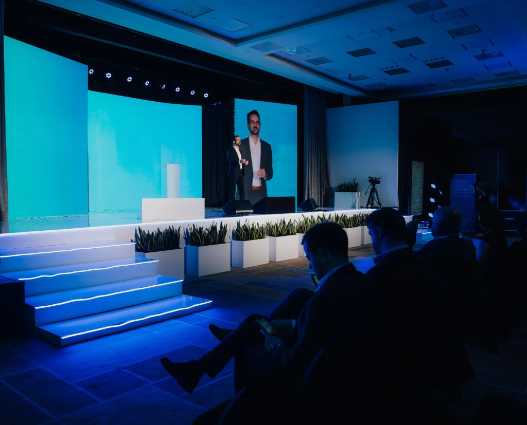 Oświetlenie i nagłośnienie dobieramy w sposób, który wzmacnia odbiór wydarzenia i buduje efekt WOW, przy zachowaniu pełnej kontroli nad budżetem. Korzystamy z ekranów LED oraz nowoczesnych systemów audio i oświetlenia, co pozwala stworzyć atmosferę dopasowaną do charakteru konferencji i zapewnia warunki do profesjonalnego nagrywania.